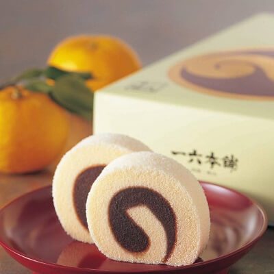 「一六タルト」は、四国特産の柚子入りのこし餡をふっくらとしたスポンジ生地で巻き上げた、四国ではお馴染みの銘菓。江戸時代にポルトガル人によって伝えられた南蛮タルトを、松山藩主が製法を松山へ持ち帰り、独自にアレンジさせたと伝えられています。定番の柚子をはじめ、抹茶やしょこら、みきゃん(みかん)、季節限定のフレーバー餡などもあります。また、松山城や道後温泉本館をモチーフにしたパッケージボックス入りもあり、四国のお土産や贈答品として、長い間支持されている人気商品です。