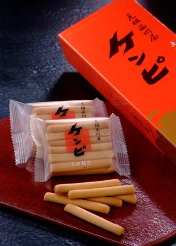 「西川屋老舗」は、江戸時代から土佐藩の御用菓子司を勤めてきた老舗和菓子店。「ケンピ」は、小麦粉と砂糖を原料に、練って薄く伸ばした小麦粉を均等に切り分け、焼き上げた干菓子で、創業者の西川屋才兵衛が白髪素麺と麩の製法をヒントにしたもの。堅いことから、堅干(ケンピ)と名付けられたのだとか。土佐藩主にも献上していた由緒あるお菓子で、現在も、創業当時と変わらぬ製法で作られています。